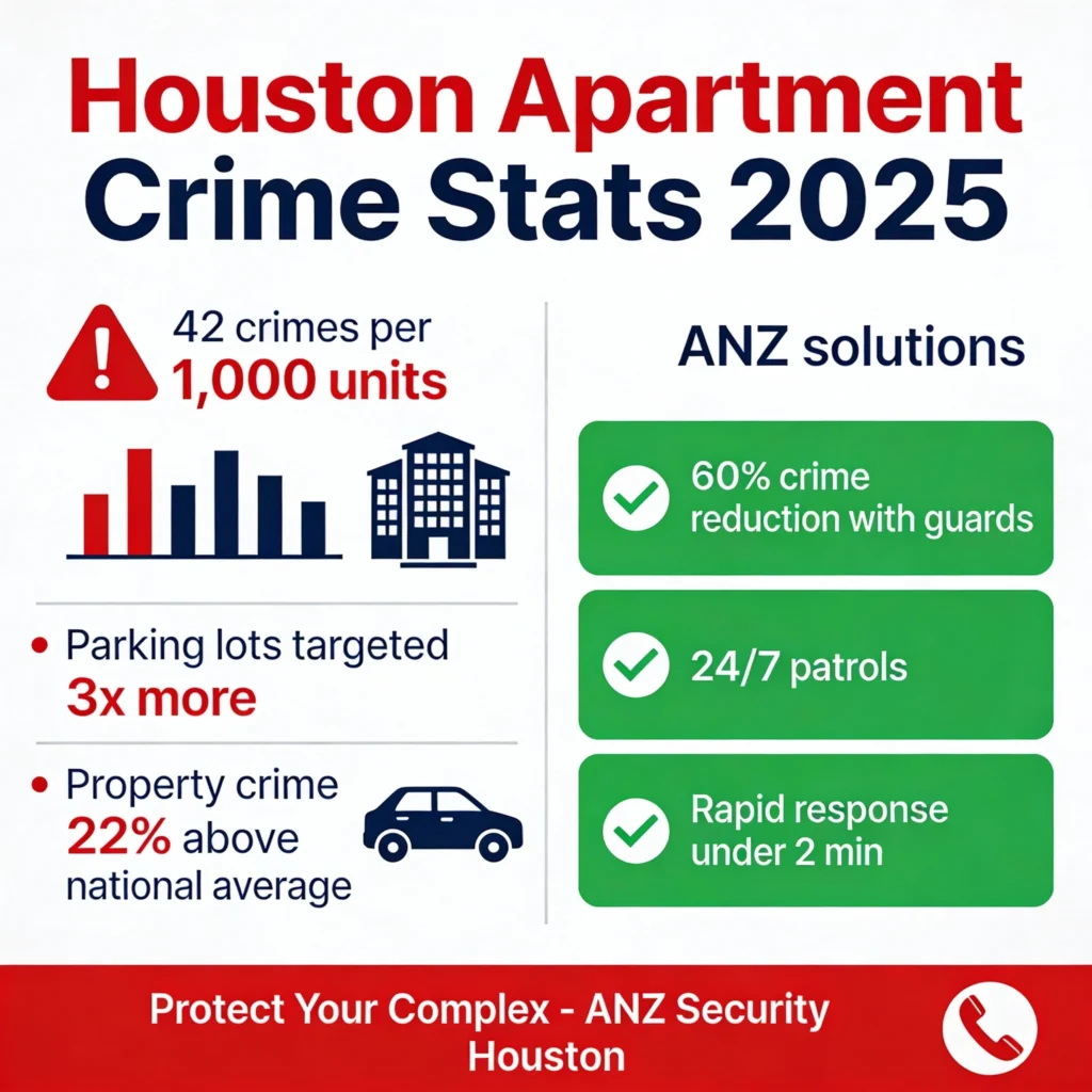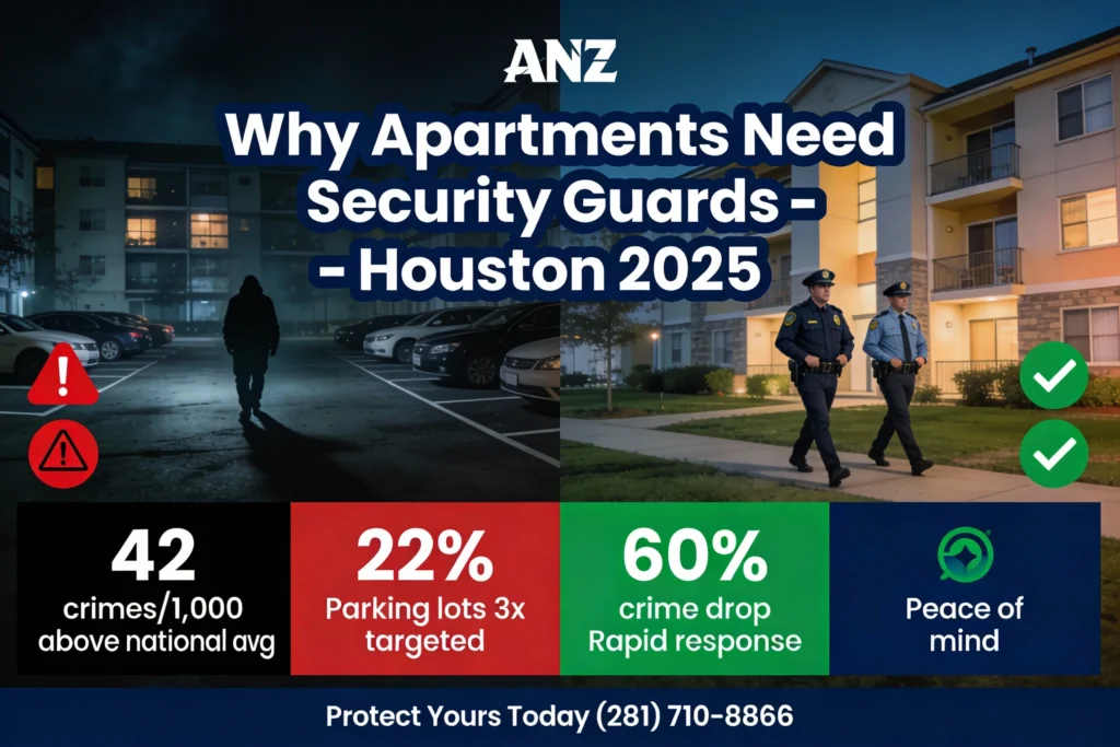 Houston’s 2025 violent crime dipped 12-14%, but property crimes persist at 40 per 1,000 residents, hitting apartments hard. Areas like Spring Branch see burglary rates 3x the national average, making apartment security guards Houston vital. ANZ counters this with proactive measures, ensuring safer living amid urban growth.