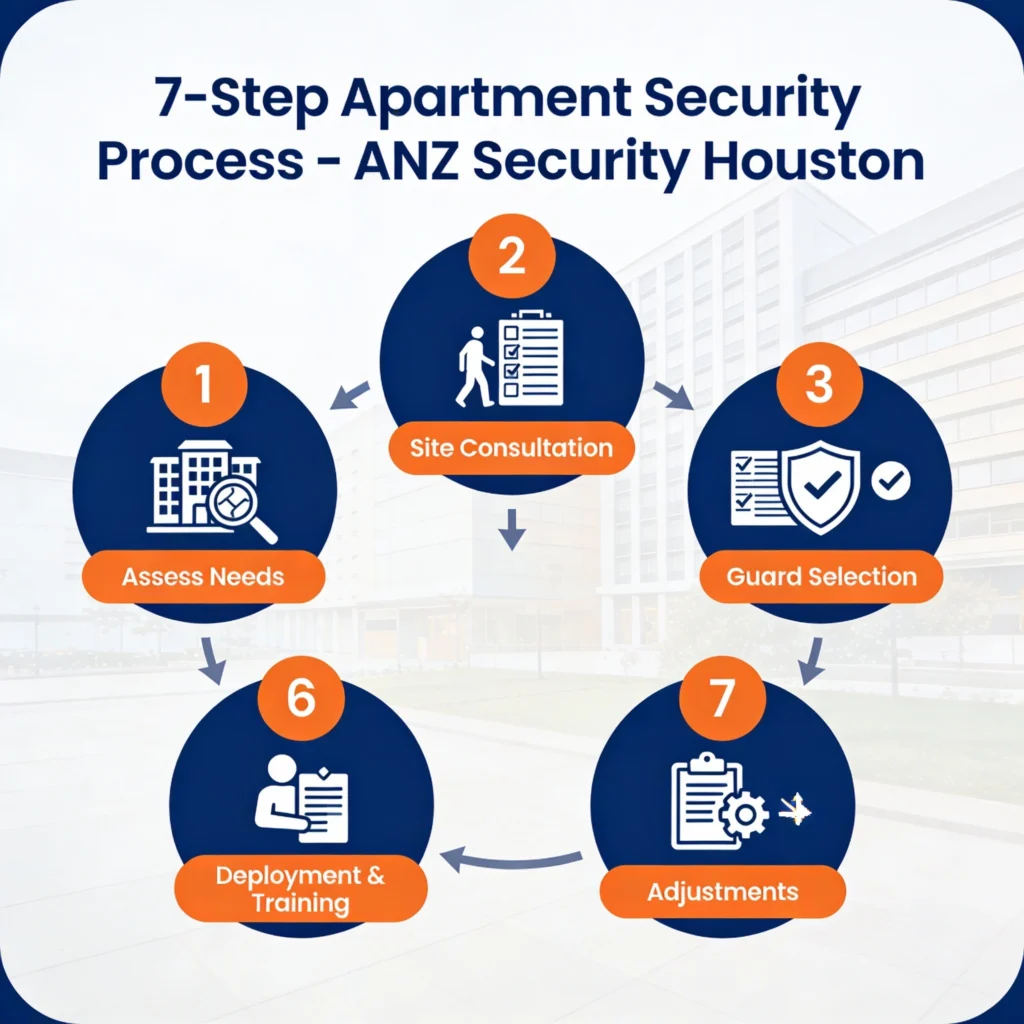 Hiring apartment security services Houston follows a proven 7-step process at ANZ Security for seamless integration.