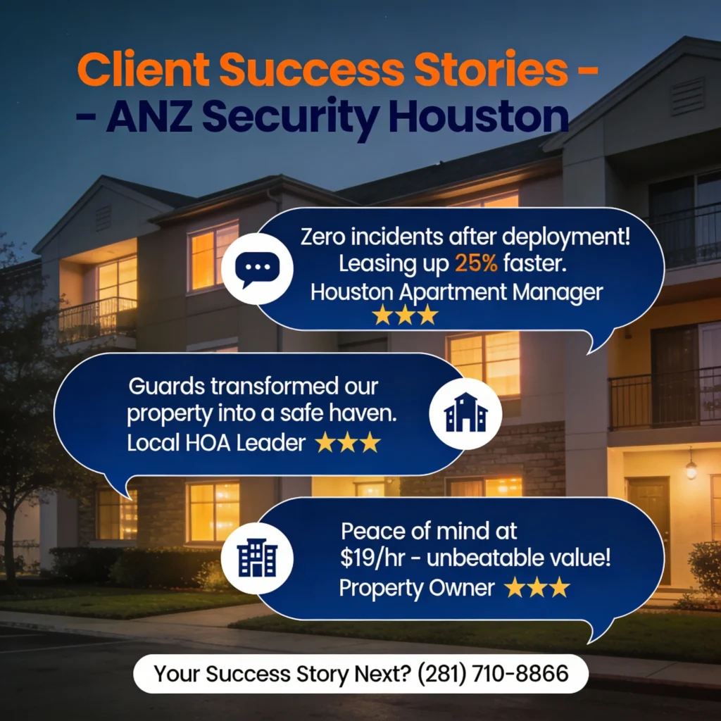 Houston complexes using ANZ report zero major incidents post-deployment, with one manager noting 25% faster leasing due to “secure” branding. “Guards transformed our property,” shares a local HOA leader. Real results prove ANZ’s edge in apartment security services Houston.